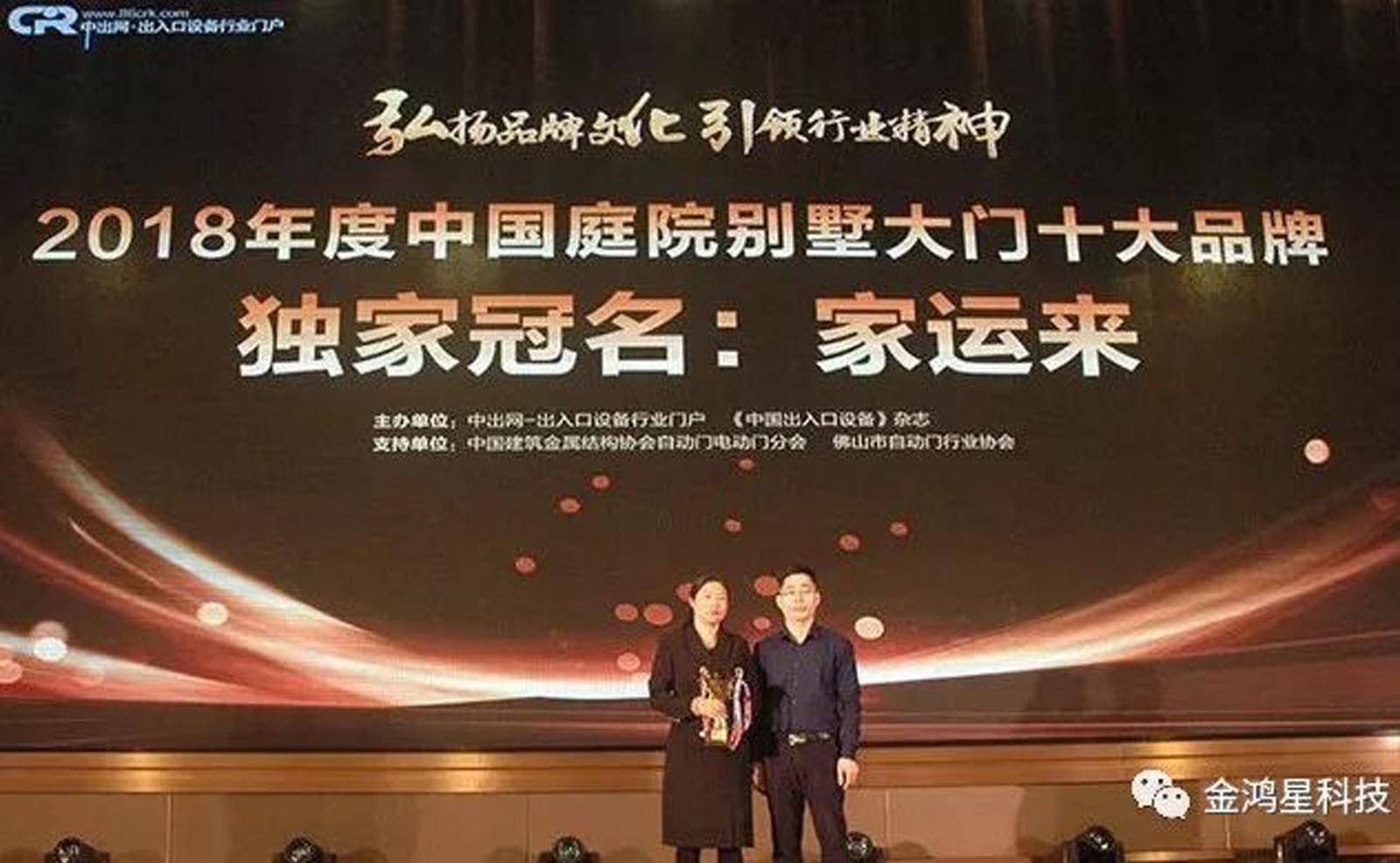 金鴻星品牌獨家冠名中出網(wǎng)&中國伸縮門網(wǎng)2018年度“中國伸縮門十大品牌”、金鴻星旗下高端品牌“家運來”獨家冠名中出網(wǎng)&中國伸縮門網(wǎng)”庭院別墅大門”品牌。
