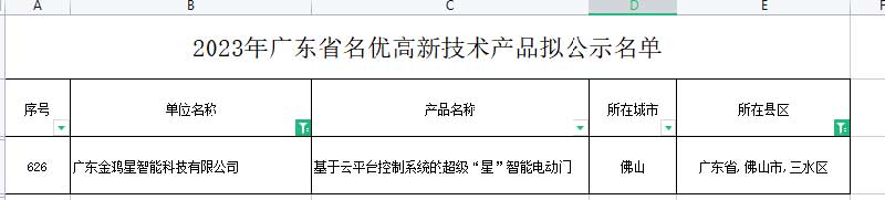 近日,廣東省高新技術(shù)企業(yè)協(xié)會公示了《2023年廣東省名優(yōu)高新技術(shù)產(chǎn)品擬通過名單》,廣東金鴻星智能科技有限公司研發(fā)的超級“星”智能電動門產(chǎn)品憑借卓越的創(chuàng)新和優(yōu)異的性能,成功入選目錄名單。